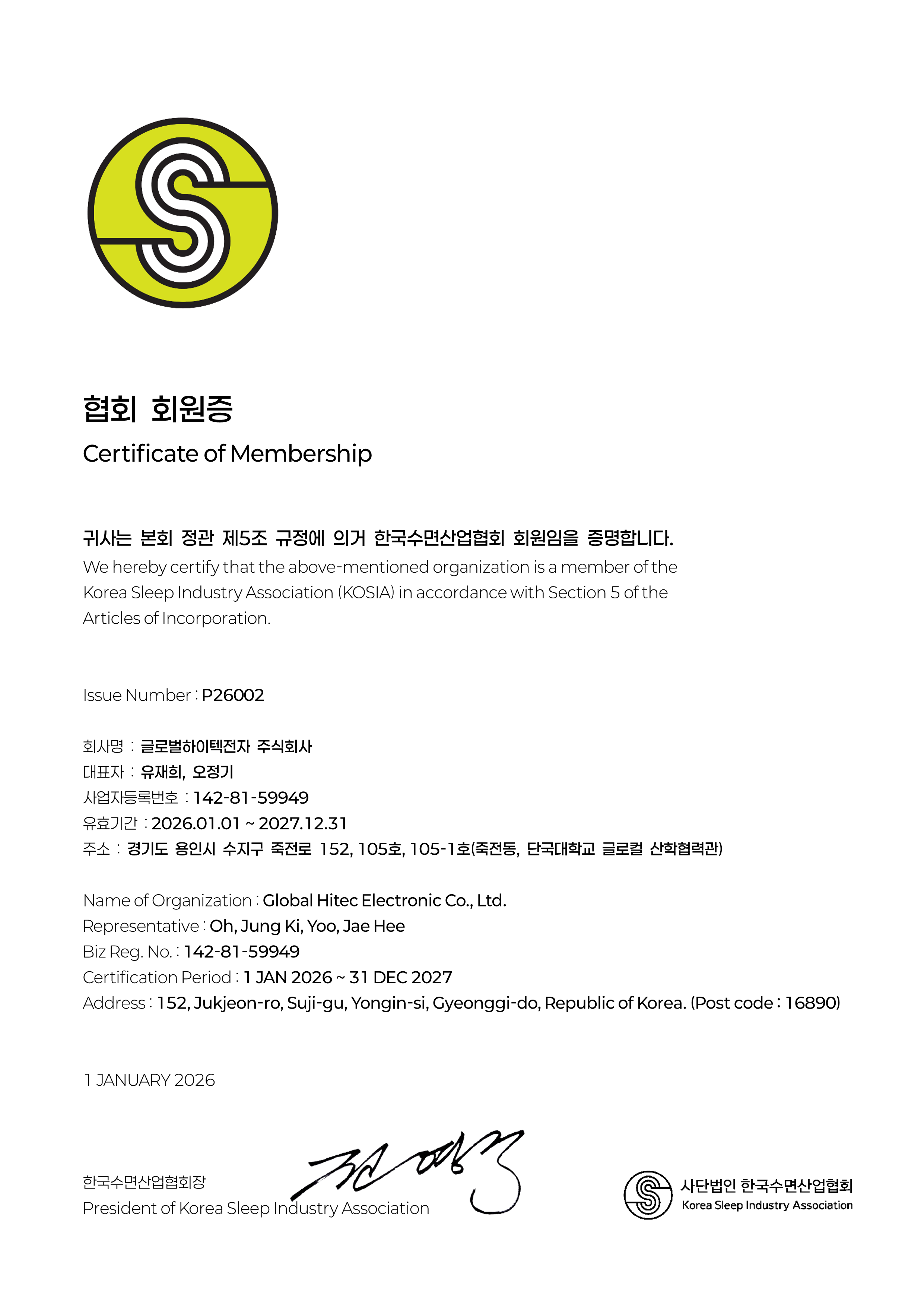 한국수면산업협회 회원증